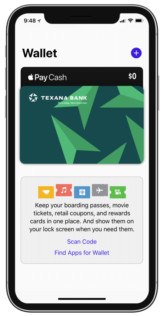 - Now that your Texana Bank Visa Debit Card is in your Apple Wallet, the card will appear on your device’s home screen when you begin at transaction with a participating merchant.